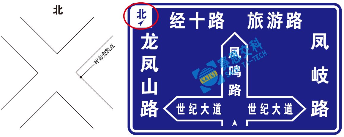 2、當(dāng)標(biāo)志設(shè)置在行駛方向右側(cè)時(shí)可在其版面左上角標(biāo)識(shí)地理方向信息;