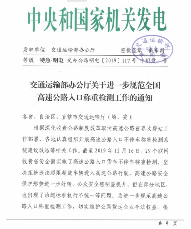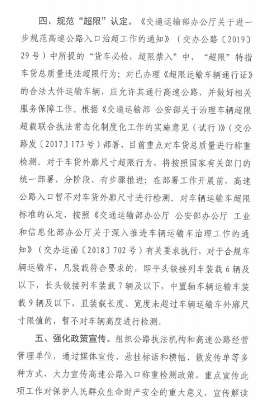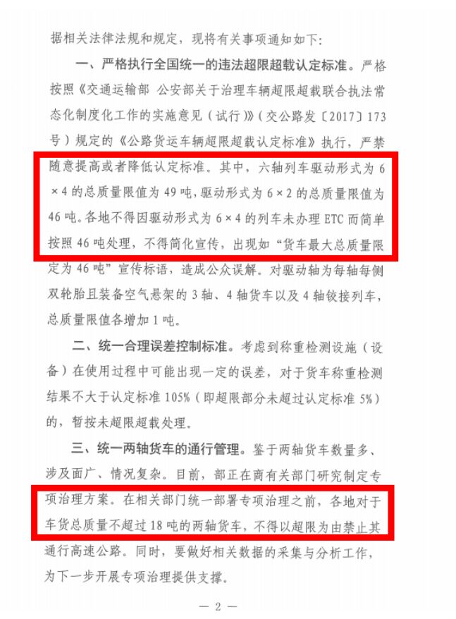為進一步相應國家關于收費公路制度改革取消高速公路省界收費站工作部署,近日,交通運輸部發(fā)文《交通運輸部辦公廳為進一步規(guī)范全國高速公路入口稱重檢測工作的通知》(以下簡稱“通知”),該通知重點強調(diào)了全國統(tǒng)一的違法超限超載認定執(zhí)行標準,并進一步明確“六軸列車驅動形式為6*4的總質量限值為49噸,驅動形式為6*2的總質量限值為46噸。各地不得因驅動形式為6*4的列車未辦理ETC而簡單按照46噸處理,不得簡化宣傳,出現(xiàn)如“貨車最大總質量限定為46噸”宣傳標語,造成公眾誤解。”;同時還要求,各地對于車貨總重不超過18噸的兩軸貨車,不得以超限為由禁止其通行高速公路。