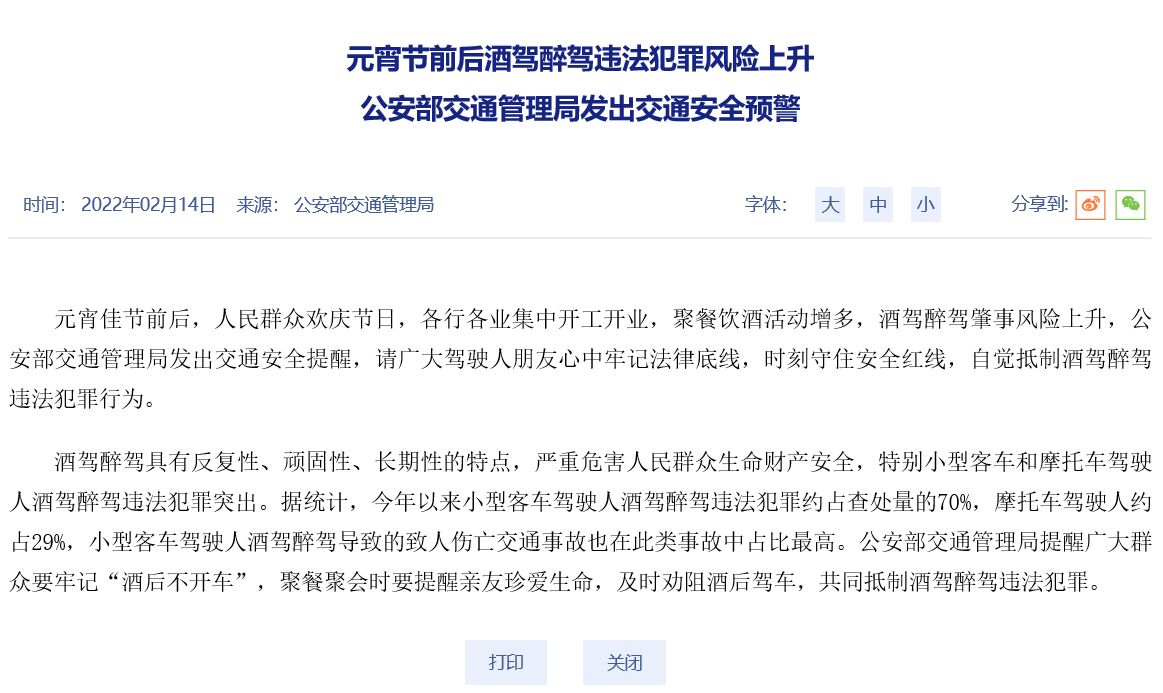 明天就是元宵節(jié),春節(jié)年假最長的企業(yè)單位、個(gè)體工商戶,也將陸續(xù)開工開業(yè),出現(xiàn)扎堆的聚餐團(tuán)聚活動,按以往經(jīng)驗(yàn),元宵節(jié)前后,酒駕醉駕等肇事風(fēng)險(xiǎn)明顯上升。為此,公安部交通管理局于2022年2月14日,特別發(fā)文《元宵節(jié)前后酒駕醉駕違法犯罪風(fēng)險(xiǎn)上升,公安部交通管理局發(fā)出交通安全預(yù)警》,旨在提醒廣大駕駛?cè)伺笥研闹欣斡浄傻拙€,時(shí)刻守住安全紅線,自覺抵制酒駕醉駕違法犯罪行為。