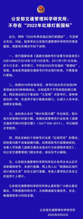 首先,這個所謂的“新版紅綠燈”,其實(shí)并非是最新的。我國當(dāng)前的紅綠燈設(shè)置標(biāo)準(zhǔn)仍是參照國標(biāo)《道路交通信號燈設(shè)置與安裝規(guī)范》(GB14886)技術(shù)要求,該標(biāo)準(zhǔn)早在2016年12月13日就已發(fā)布,并于2017年7月1日正式實(shí)施,至目前,也尚無最新的升級版本,最新版號仍是“GB14886-2016”,在該標(biāo)準(zhǔn)中,就已提出關(guān)于這種新型“信號燈盤組合”的相關(guān)內(nèi)容,所以,這個所謂的“新版紅綠燈”,根本沒有“新”字一說,只是這個叫法的始作俑者,嘩眾取寵,誤導(dǎo)大眾。為此,公安部交通管理科學(xué)研究所也于2022年8月22日專門發(fā)文給予辟謠。