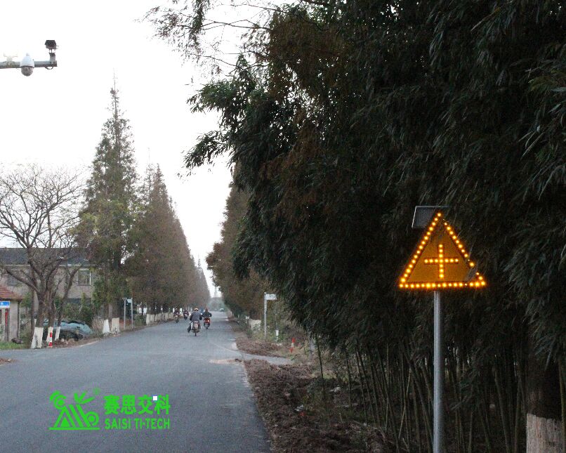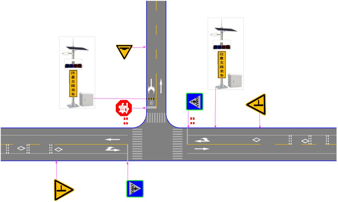 A)支線上設置減速讓行、或停車讓行標志,有條件可采用太陽能主動發(fā)光標志,或于標志上方配置太陽能爆閃警示燈。