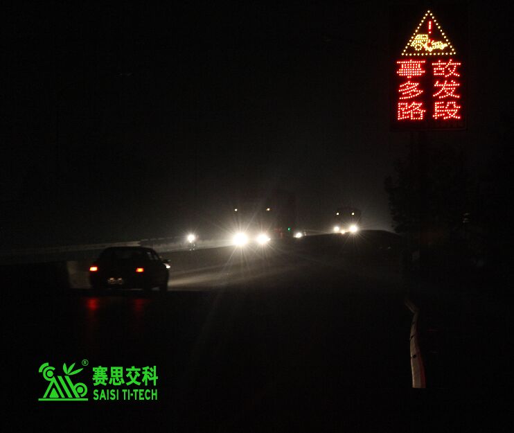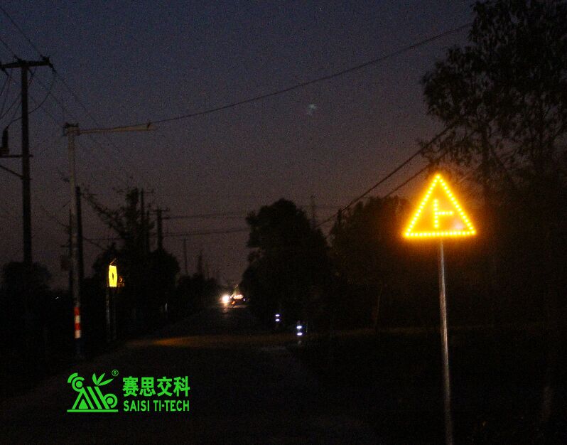 ②交通標志。公路主線應設置必要的“限速+注意前方岔口”標志,有條件的,可采用太陽能主動發(fā)光標志,以提升遠距離視認性,及夜間警示效果。