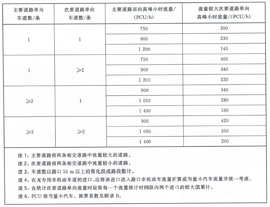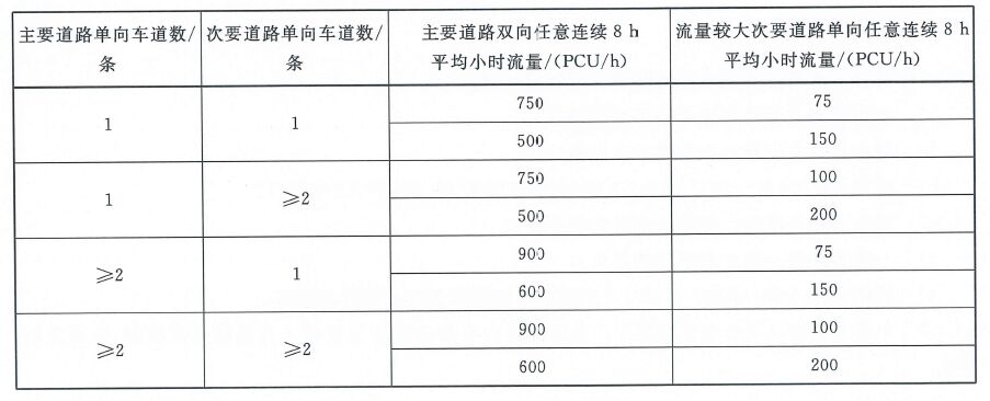 I、條件一:路口機動車高峰小時流量超過下表所列數(shù)值時;